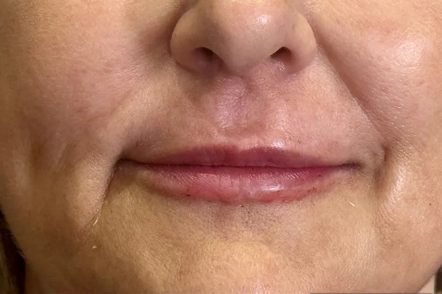 To improve skin laxity of lower face and improve appearance of her lips. 64-year-old female received Filler to her lips and lower facial folds.